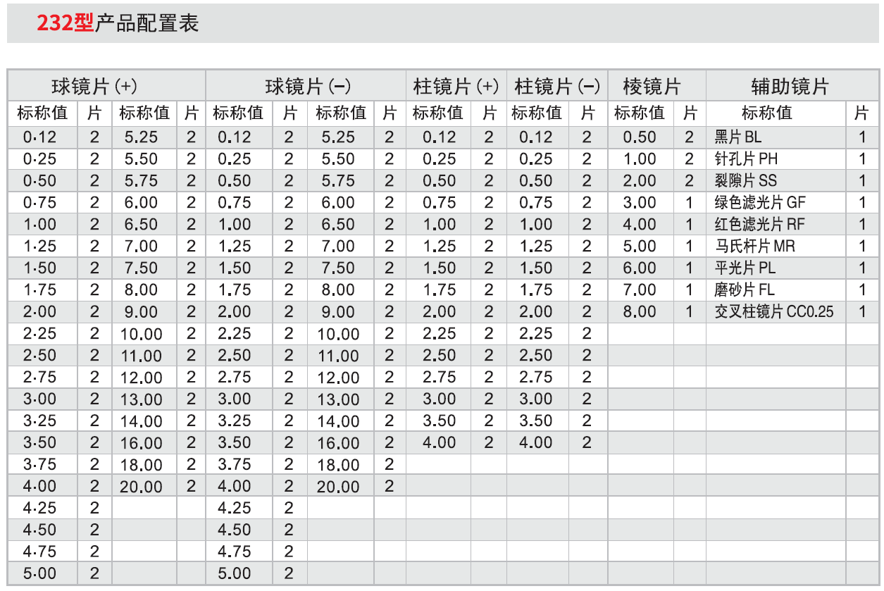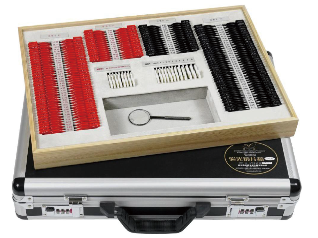 镜片:镜片通光孔径为25mm,轻巧耐用。配戴更舒适。手柄度数标识采用单面刻字,更方便使用与检验。柱镜与棱镜的轴线标识直接刻于镜面上,永不会产生轴位变动
