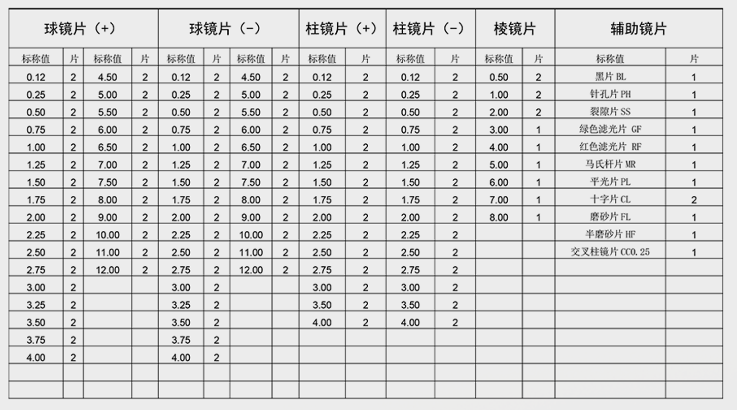 镜片:镜片通光孔径为25mm,轻巧耐用。配戴更舒适。手柄度数标识采用单面刻字,更方便使用与检验。柱镜与棱镜的轴线标识直接刻于镜面上,永不会产生轴位变动