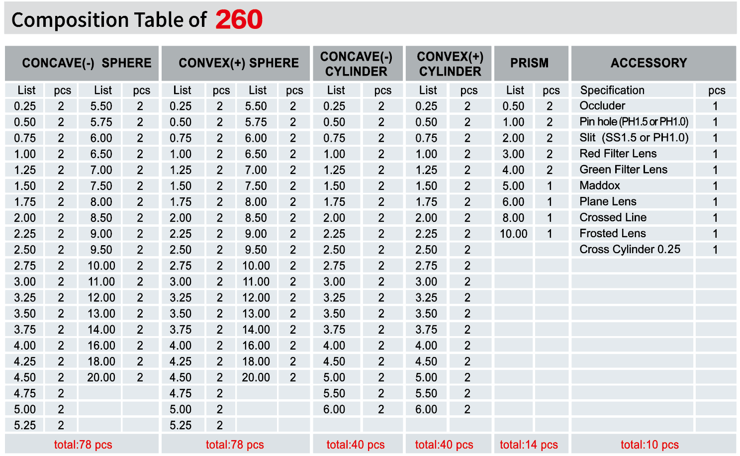 - * Color-coded metal rim/handles - A4 type, with nominal powers engraved on both sides, Red for concave and Black for convex lenses, while Grey for the prismatic lenses and accessories