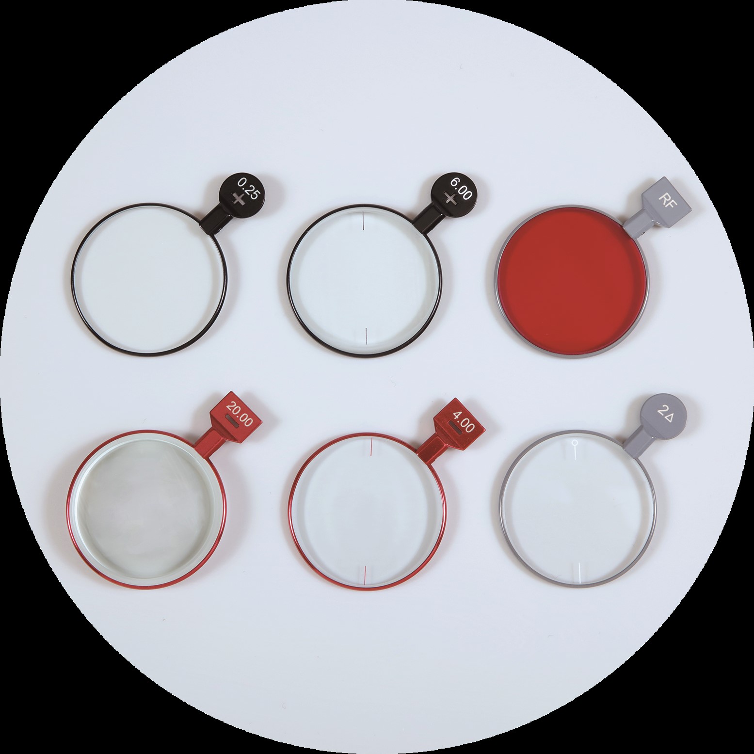 - Color-coded metal rim/handles -A4 type, with nominal powers engraved on both sides, Red for concave and Black for convex lenses, while Grey for the prismatic lenses and accessories