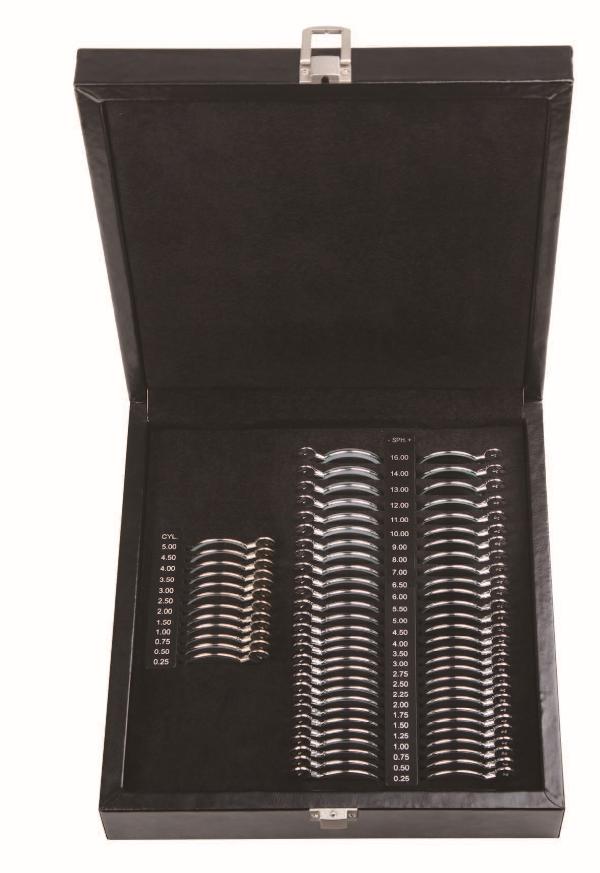 • Full-aperture trial case lenses 68 pieces included, of accurate powers and perfect finish,of which 12 pieces are Minus or Plus cylinders