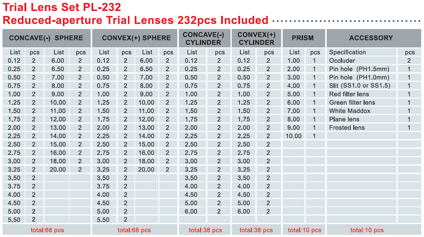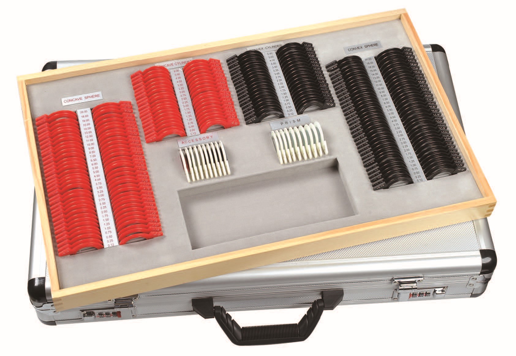 - Reduced-aperture trial case lenses 232 pieces included, with 26mm diameter clear lenses, of accurate powers and perfect finish