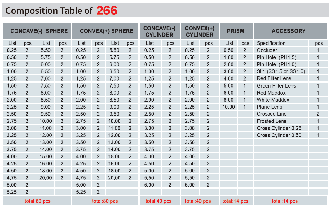 - Full-aperture trial case lenses 268 pieces included, of accurate powers and perfect finish