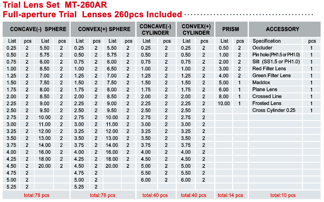- Full-aperture trial case lenses 260 pieces included, with AR coating, of accurate powers and perfect finish