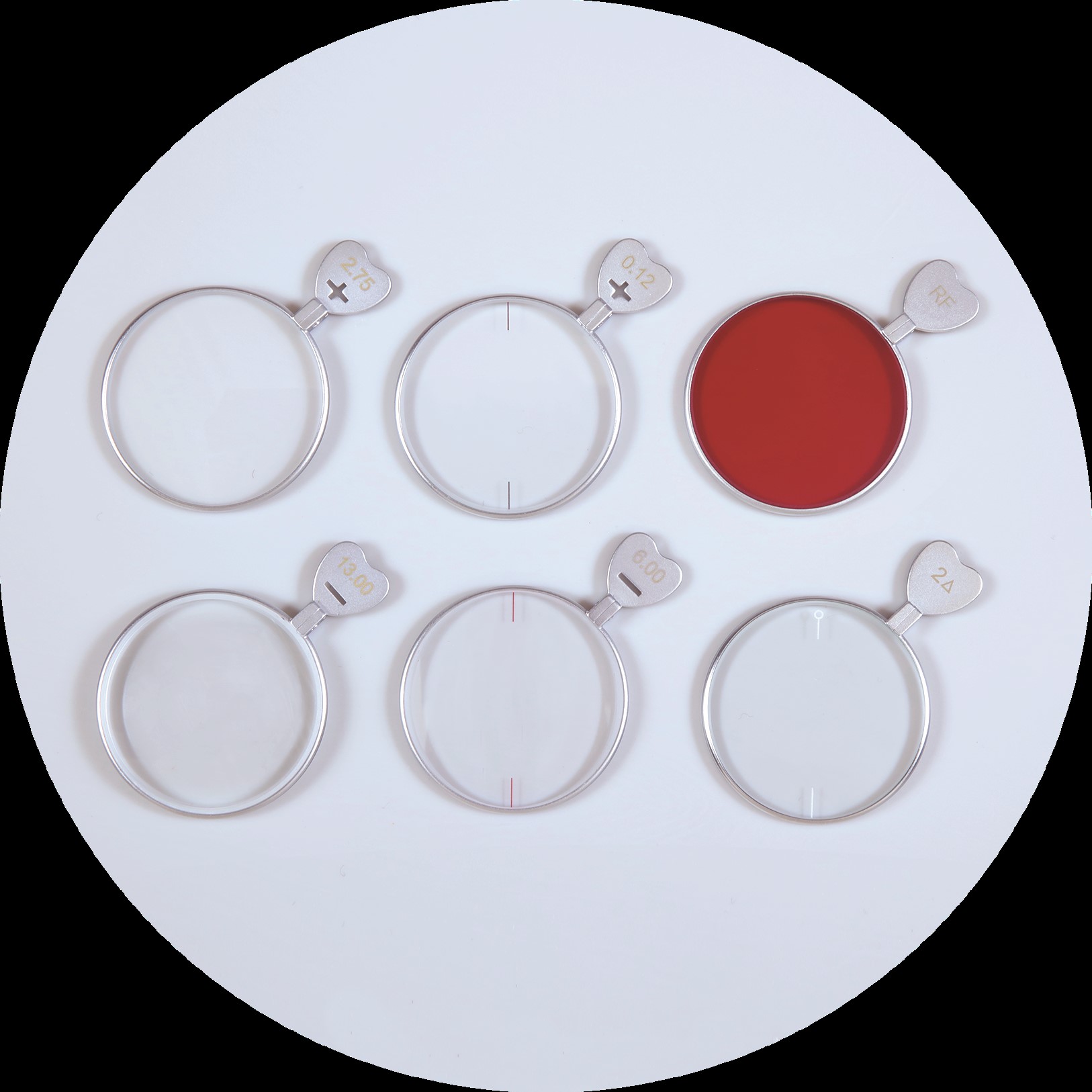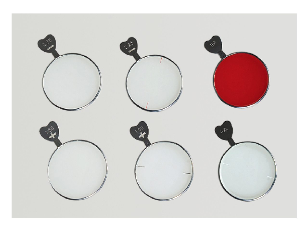 - Metal rim/handles - A9 type, of one-piece rim/handles, with nominal powers engraved on both sides