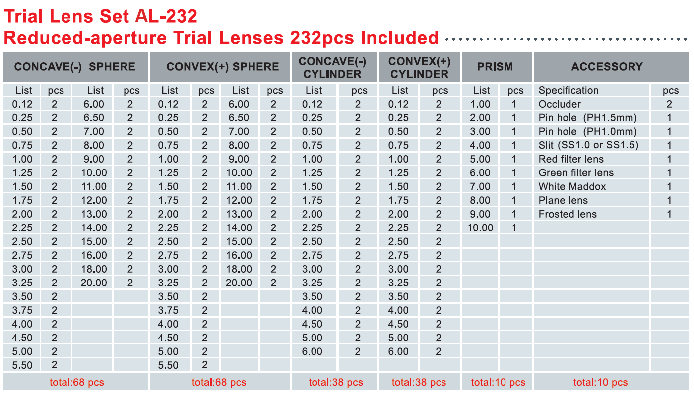 - Reduced-aperture trial case lenses 232 pieces included, with 26mm diameter clear lenses, of accurate powers and perfect finish, fitting mounts well to avoid rotation
