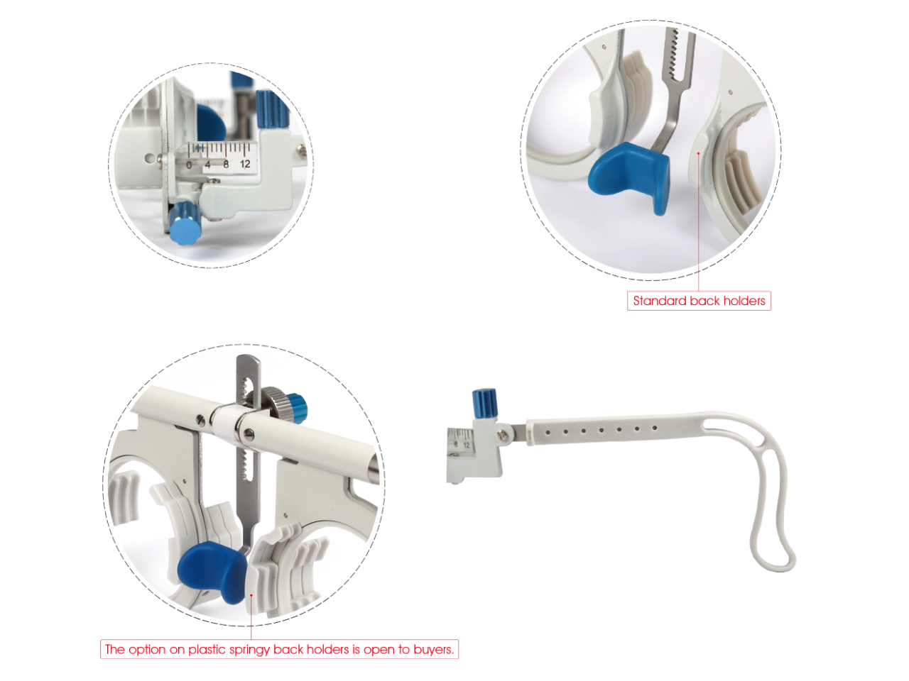 Product specifications:PD scale: 50mm~80mmNet weight: 55gReliable plastic lens holdersKnobs fastened with screwsBack lens holders of round cornersComfortable ear restsAvailable for 5 pieces trial lenses to be inserted on each side