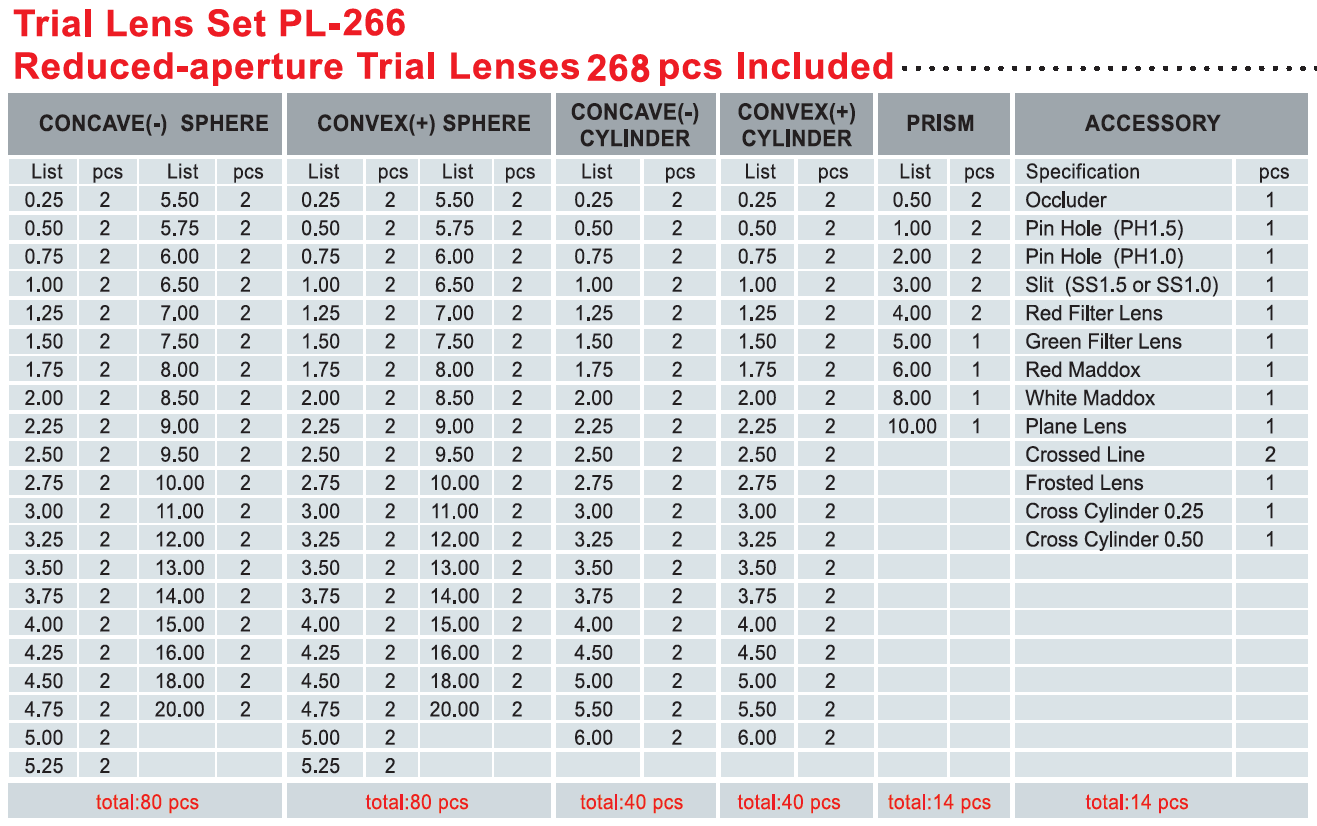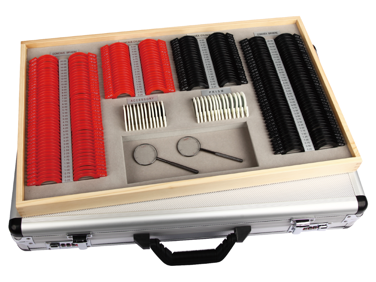- Reduced-aperture trial case lenses of 268 pieces included, with 26mm diameter clear lenses, of accurate powers and perfect finish