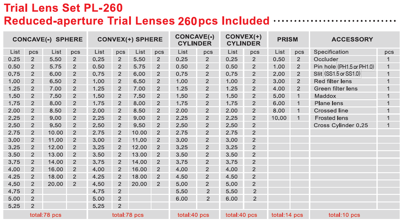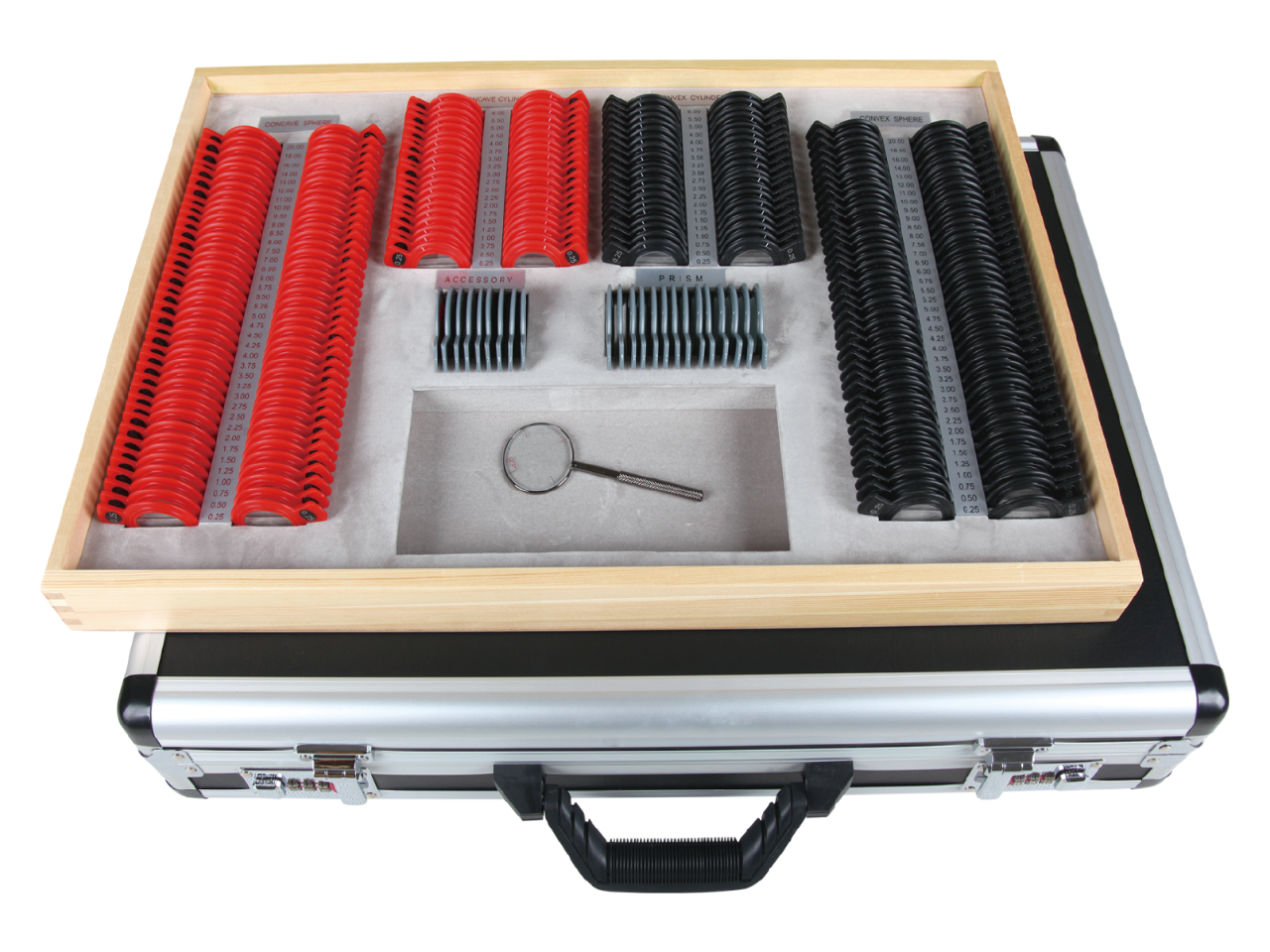 - Reduced-aperture trial case lenses of 260 pieces included , with 26mm diameter clear lenses of, accurate powers and perfect finish