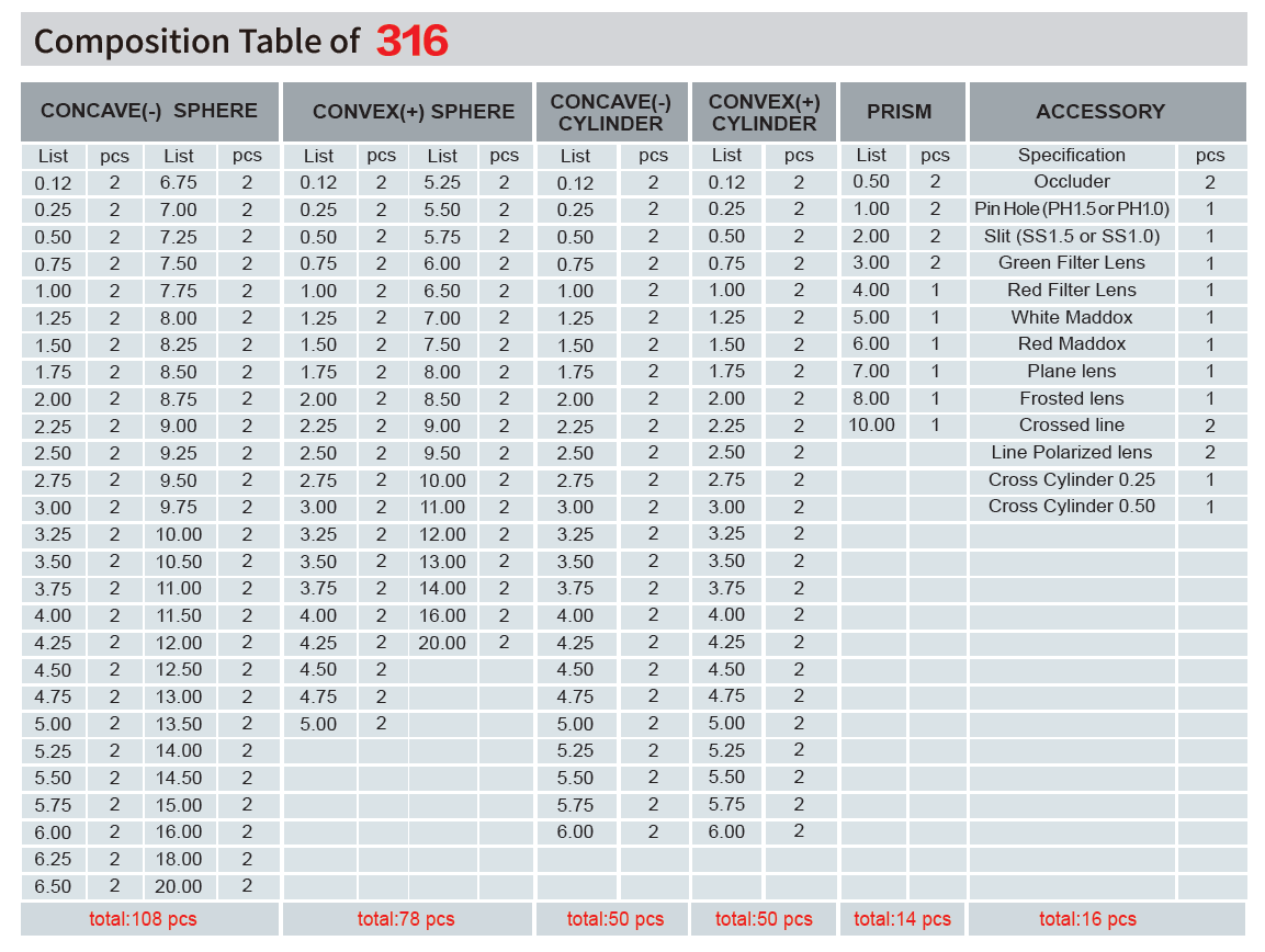 - Full-aperture trial case lenses 316 pieces included, of accurate powers and perfect finish